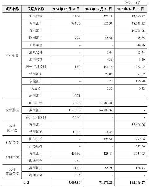 招股书显示,报告期各期,联合动力对汇川技术的关联应付项目包含应付账款、应付票据、租赁负债,各期末金额与前述《专项报告》中的数据均不一致,另外,联合动力对汇川技术没有其他应付款。