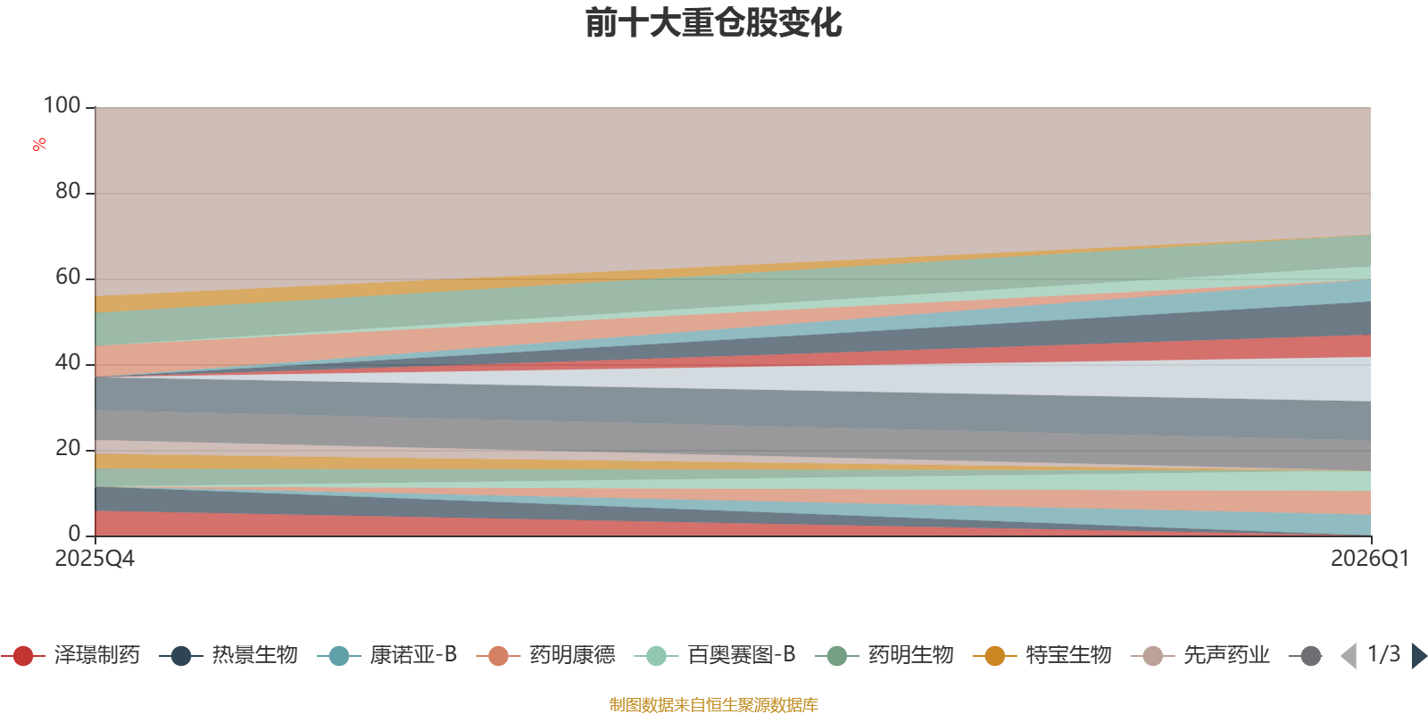该基金持股集中度较高。截至2026年一季度末,基金十大重仓股分别是康方生物、荣昌生物、信立泰、科伦博泰生物、石药集团、药明康德、恒瑞医药、信达生物、康诺亚-B、百奥赛图-B。