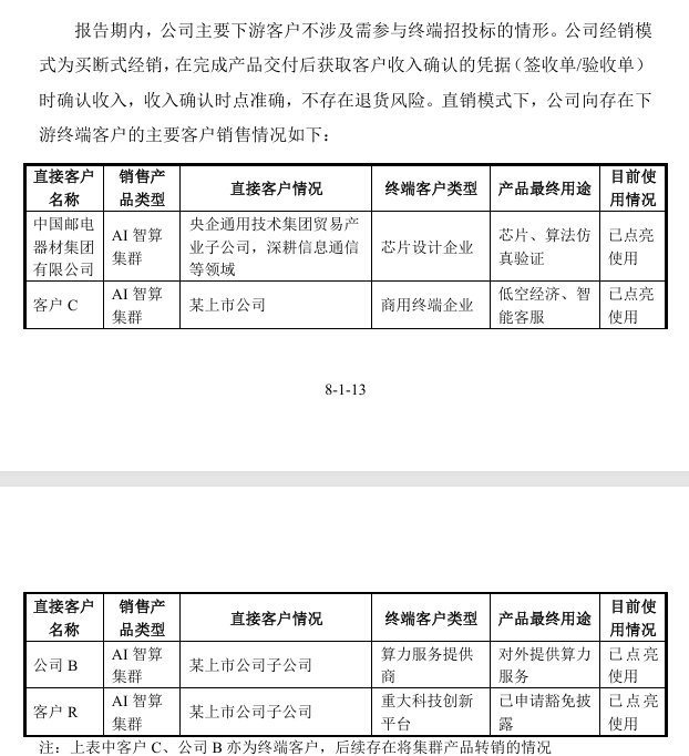 收入与客户方面,摩尔线程表示,直销模式下,公司下游终端客户的主要客户中,客户C与公司B均为信息技术行业公司,存在使用AI算力相关业务场景,自身为AI算力集群产品终端需求客户,同时,其基于商业可行性考量,亦会转售AI智算集群产品;中国邮电器材集团有限公司为专业化信息通信产品供应链综合服务央企;客户R母公司为供应链集成服务商,其作为AI智算集群产品供应链一环,系根据终端客户产品需求进行采购。