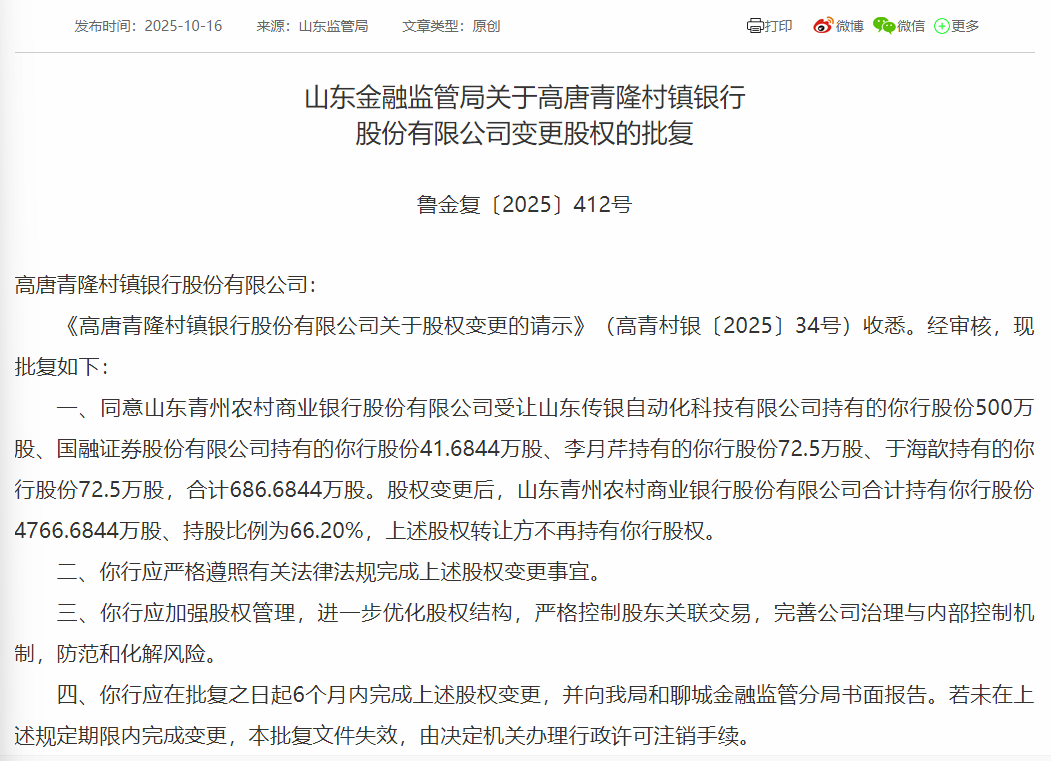 10月16日,山东金融监管局发布多则行政批复公告,其中包括核准菏泽农村商业银行、山东青州农村商业银行分别吸收两家村镇银行股权的公告。