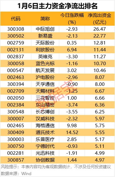 净流出方面,中际旭创、蓝色光标尾盘主力资金净流出金额均超2亿元,歌尔股份、天际股份、北方华创、天赐材料、三七互娱、高德红外等净流出均超1亿元。