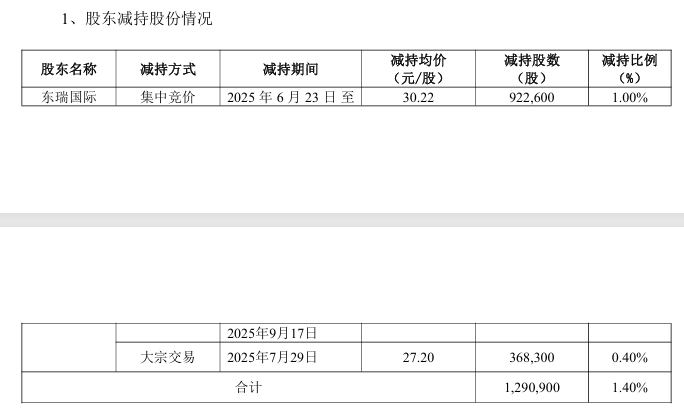 值得注意的是,去年9月,公司披露了东瑞国际上一轮减持实施情况公告。东瑞国际于2025年6月23日至2025年9月17日共计减持公司股份1,290,900股,减持股份数量占公司总股本的1.40%,共计减持套现3789.87万元。