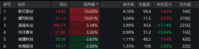 电动两轮车板块,新日股份、爱玛科技涨停,华洋赛车、涛涛车业涨超3%。
