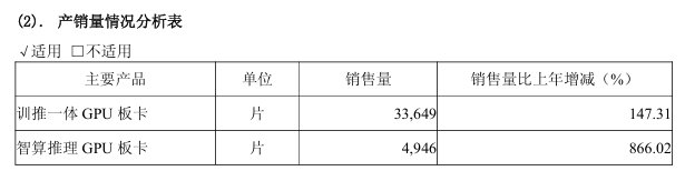 沐曦股份收入增长的核心驱动力来自GPU产品销量的增长。从产销数据来看,该公司2025年训推一体GPU板卡(曦云C系列为主)销量为3.3649万片,同比增长147.31%;智算推理GPU板卡销售量为4946片,同比增长866.02%。截至报告期末,其GPU产品累计销量已超过5.5万颗。