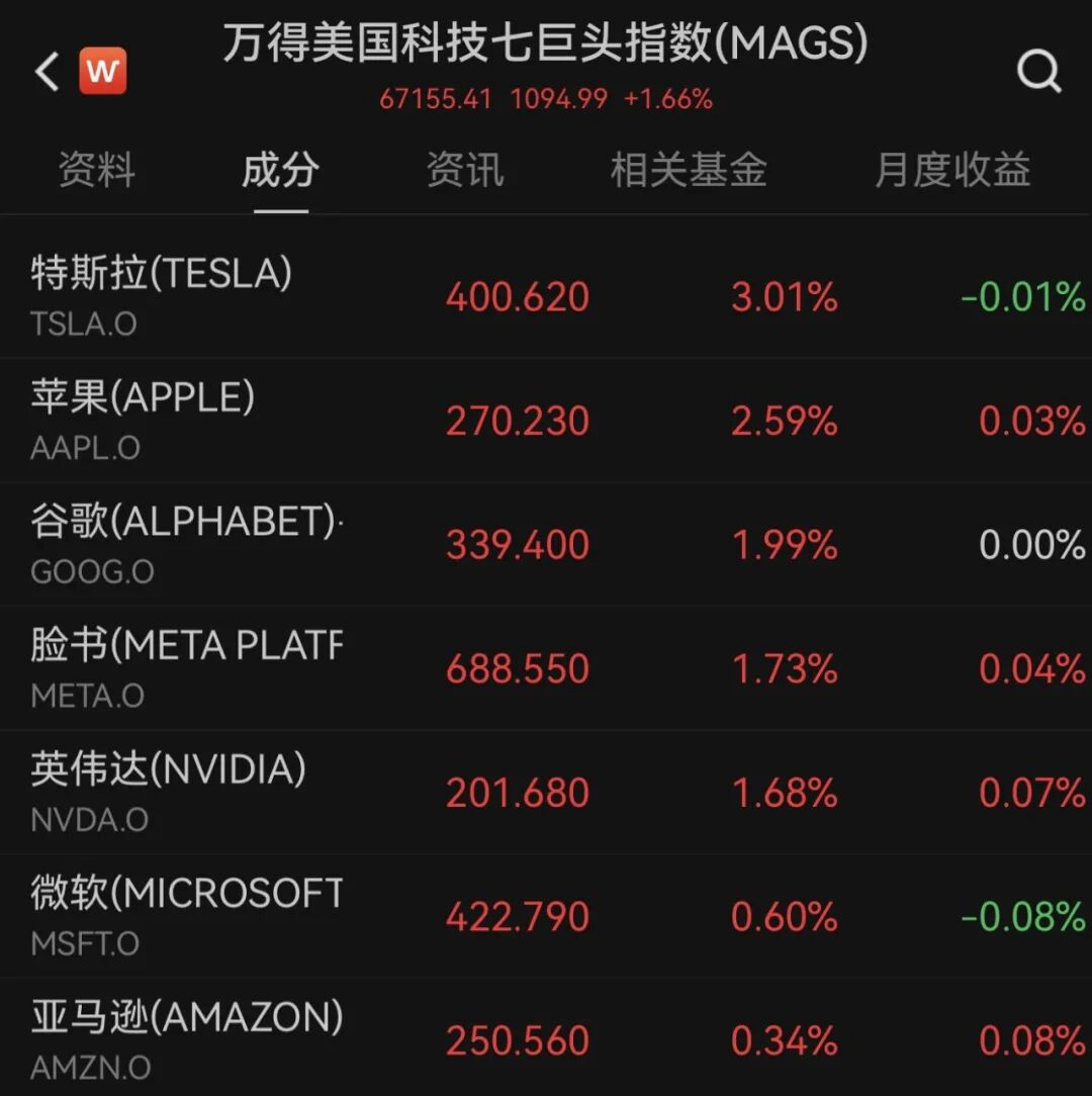 大型科技股集体上涨。万得美国科技七巨头指数上涨1.66%,特斯拉涨超3%,苹果涨超2%,谷歌、Meta、英伟达涨超1%,微软、亚马逊小幅收涨。