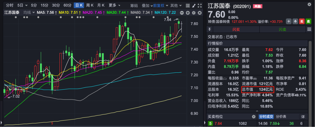 最新公告显示,总市值124亿元的A股公司江苏国泰(002091),拟使用不超过120亿元委托理财、不超18.3亿元进行证券投资,二者合计超过138亿元。
