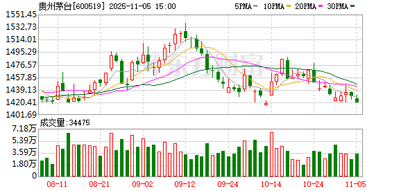 截至11月5日收盘,贵州茅台报1420.08元/股,跌0.62%,总市值1.78万亿元。