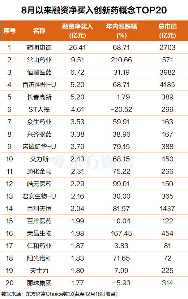 东方财富Choice数据显示,自今年8月以来,杠杆资金抢筹了一批创新药概念股,融资净买额前20个股合计近90亿元。
